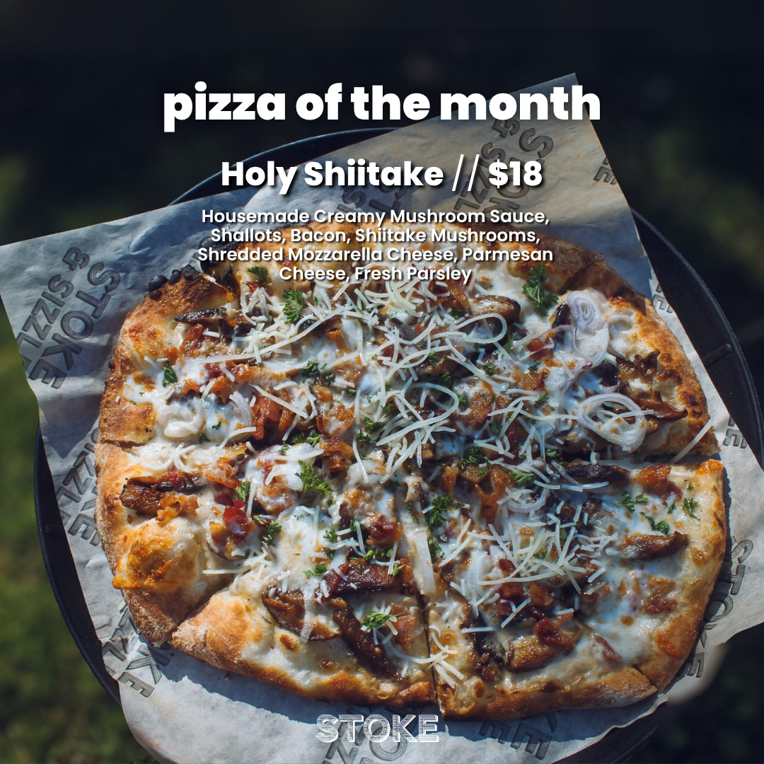 Housemade Creamy Mushroom Sauce, Shallots, Bacon, Shiitake Mushrooms, Shredded Mozzarella Cheese, Parmesan Cheese, Fresh Parsley