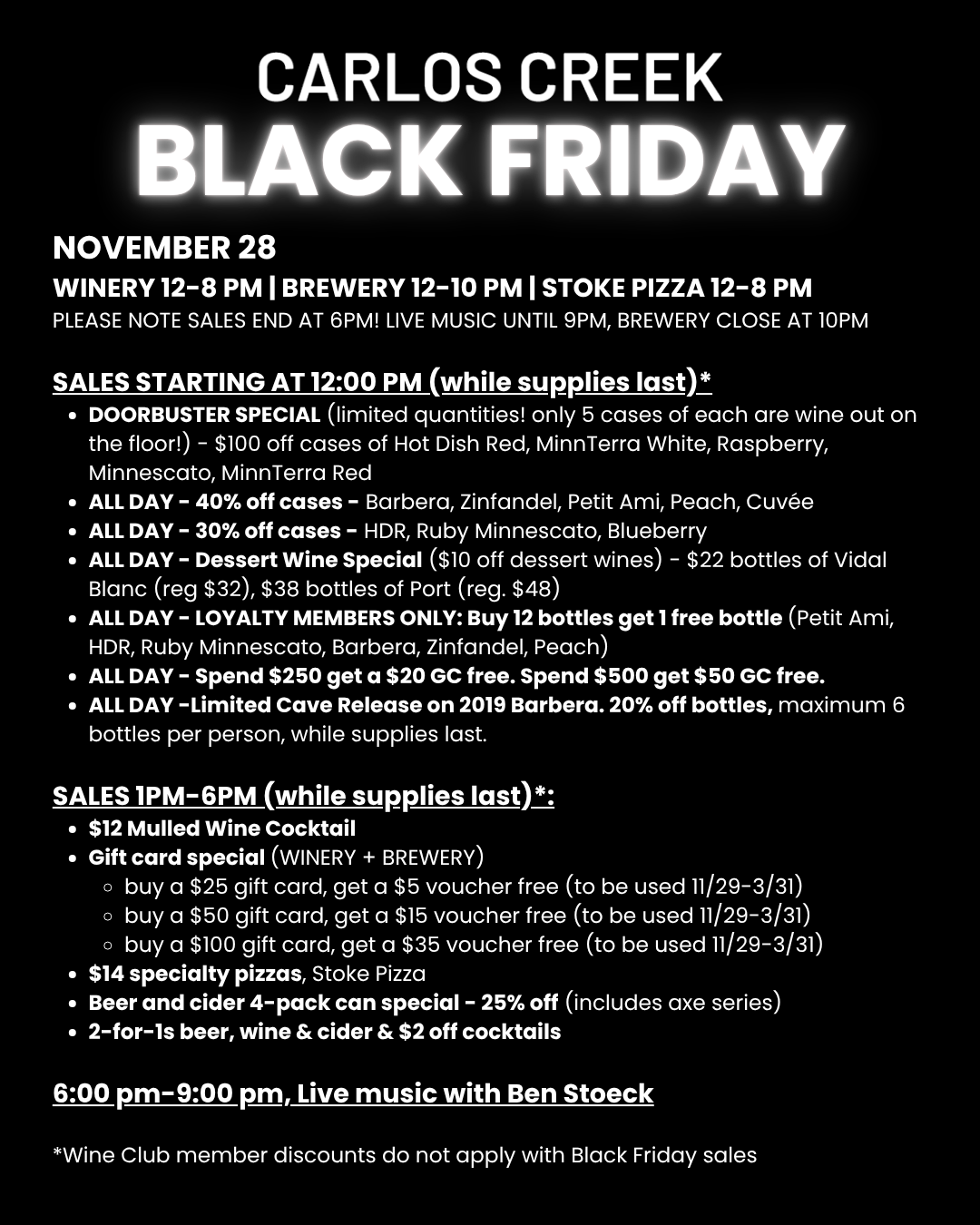 Get ready for the best sale of the year on Black Friday at Carlos Creek Winery / 22 Northmen Brewing Co. in Alexandria, MN! Gift card sale online + in-store, all other sales in-store only!