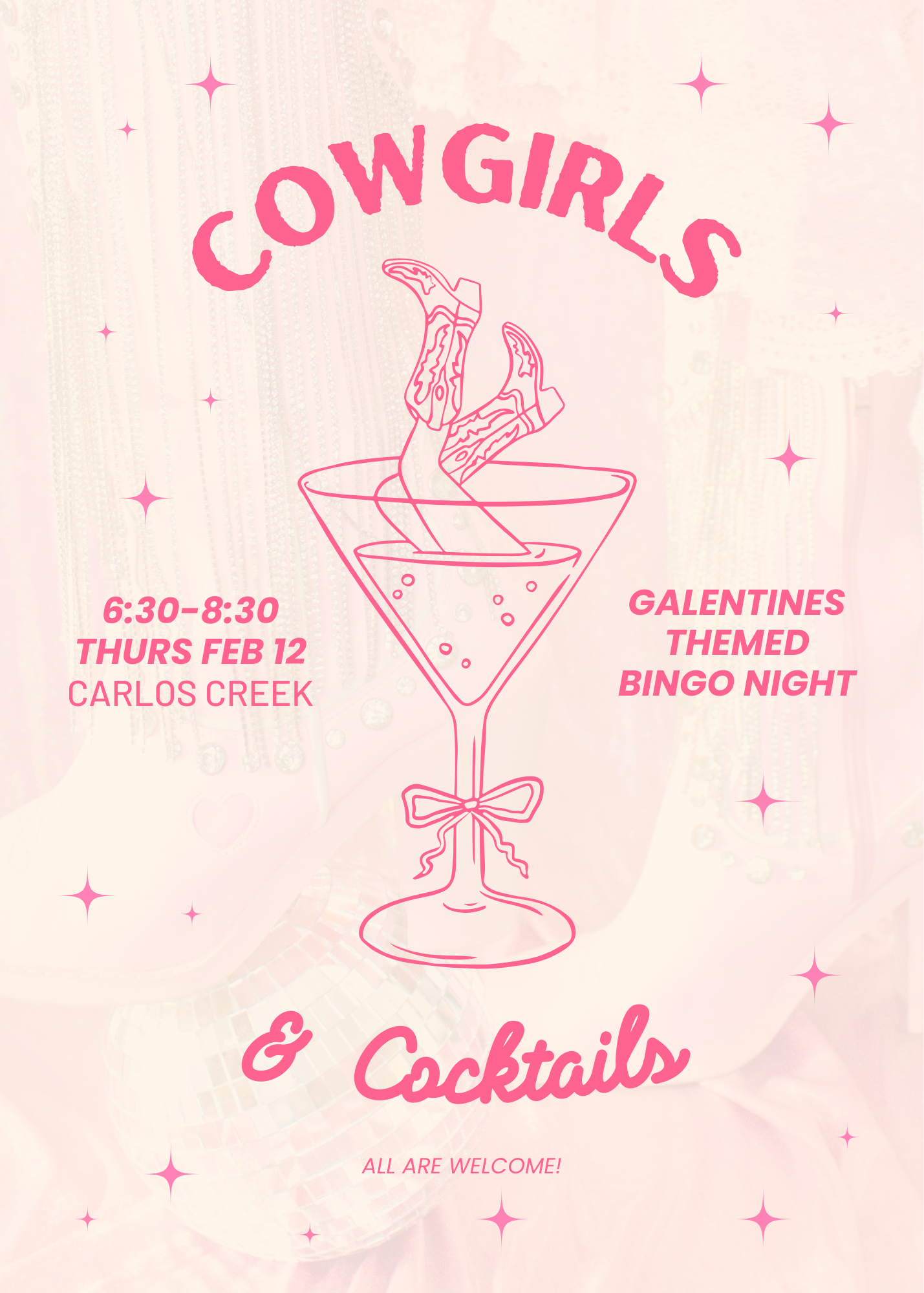 Gather the girls and saddle up for a 'Cowgirls & Cocktails' themed bingo night to celebrate Galentine's Day on Thursday, February 12 at Carlos Creek in Alexandria, MN.