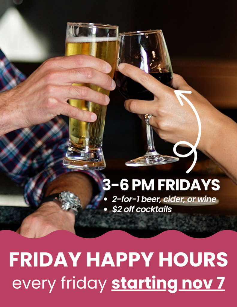Whether you’re clinking glasses with friends after work, cozying up by the fire with your favorite pour, or trying something new from the tap, our happy hour is your perfect weekend warm-up.