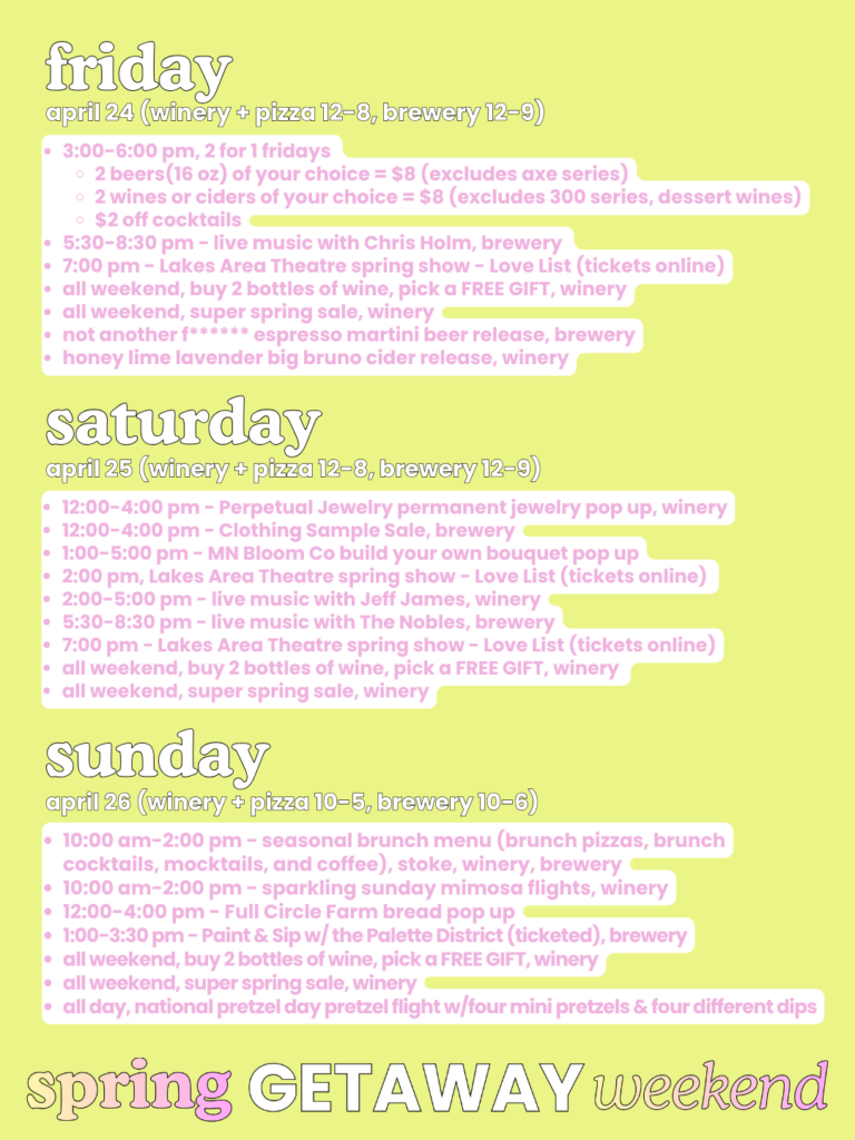 Join us for a whole weekend of relaxing and fun-filled events during Spring Getaway Weekend at Carlos Creek from April 24-26, 2026 in Alexandria, Minnesota! We've planned an exciting mix of live entertainment, local collaborations, seasonal flavors, and unique experiences to make your spring weekend in Alexandria, MN unforgettable.