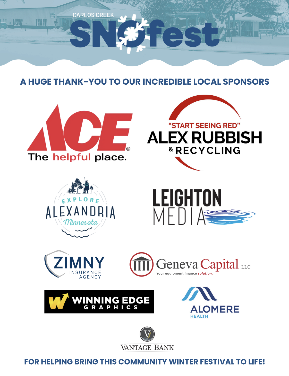A huge thank-you to our incredible local sponsors for helping bring this community winter festival to life: ACE Hardware, Alex Rubbish & Recycling, Alomere Health, Explore Alexandria, Zimny Insurance Agency, Vantage Bank, Winning Edge, Leighton Media, Geneva Capital.