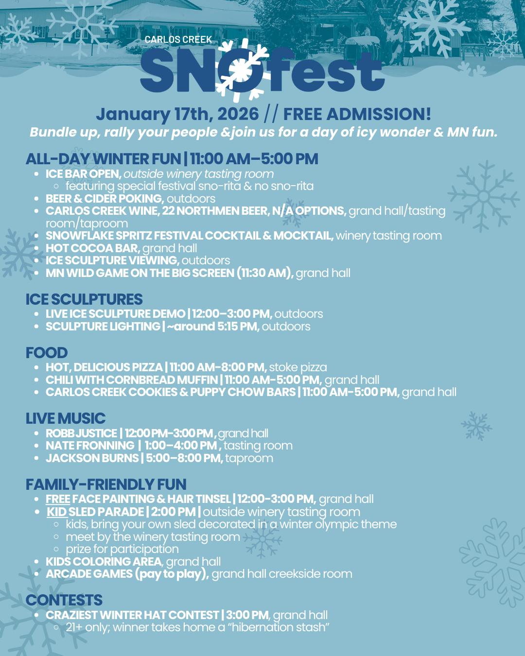 ❄️ SnoFest 2026 at Carlos Creek Winery – January 17, 2026 | Alexandria, Minnesota ❄️