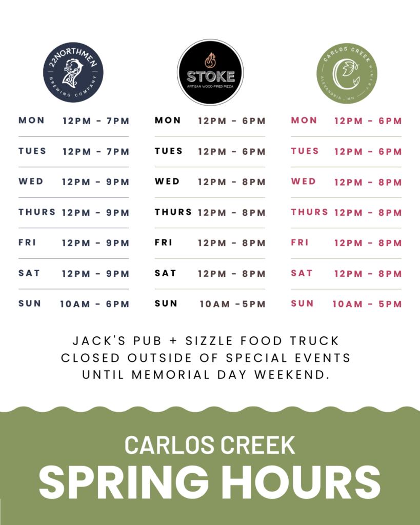 Spring hours begin April 6, 2026 at Carlos Creek -- open 7 days a week again for you to enjoy spring sunshine!